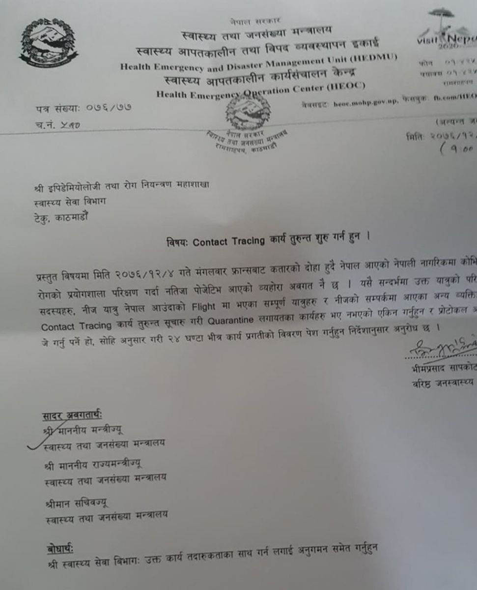 यही ४ गते फ्रान्सबाट कतार हुँदै काठमाडौं आएकी एक १९ वर्षीय युवातीलाई कोरोना संक्रमण देखिएको हो। उनलाई कोरोना संक्रमण देखिएपछि इकाईले अन्यको पनि खोजी सुरु गर्न भनेको हो।