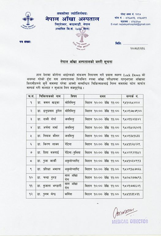 अस्पतालमा नियमित रुपमा आँखा परीक्षणमा रहेका आँखाका बिरामीहरुलाई कुनै समस्या परेमा आफ्ना सम्बन्धित चिकित्सकलाई बिहान १० देखि ११ बजे १ घण्टा फोन मार्फत सम्पर्क गर्न सक्ने व्यवस्था गरेको जानकारी दिएको छ।