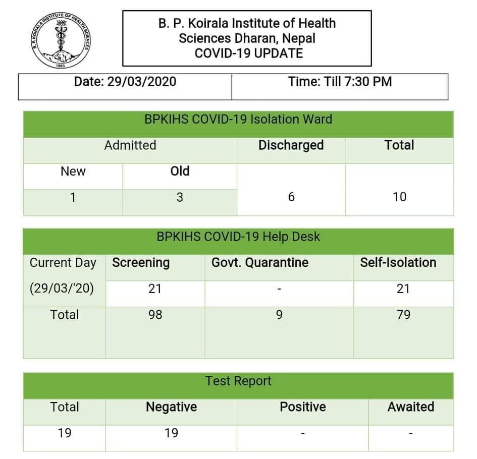 आइतबार साँझ प्राप्त रिपोर्ट अनुसार १९ जनामै कोरोना नेगेटिभ रिपोर्ट आएको प्रतिष्ठानका सहप्रवक्ता डा अशोक ऐरले जानकारी दिए।