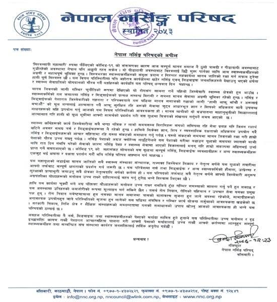 विज्ञप्तिमा भनिएको छ, 'कोभिड १९ को पहिचान, रोकथाम र उपचारका लागि खटिने सम्पूर्ण स्वास्थ्यकर्मीहरुको लागि उच्च सम्मान र सुरक्षाको वातावरण तयार पार्न हामी अपिल गर्दर्छौ।'