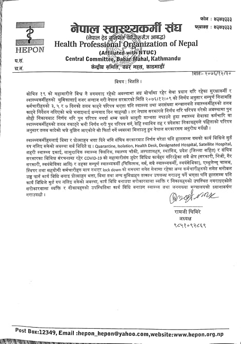 काठमाडौं - नेपाल स्वास्थ्यकर्मी संघले कोरोनाको रोकथाम तथा उपचारमा खटिएका स्वास्थ्यकर्मीको तलब नकाट्ने निर्णय कार्यान्वयन गर्न माग गरेको छ।