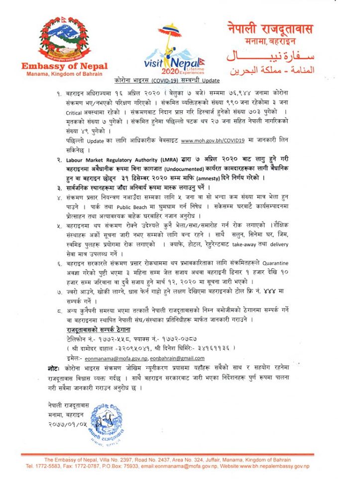 योसँगै कोरोना संक्रमित नेपालीको संख्या ४९ पुगेको छ। बहराइनमा अहिलेसम्म ९ सय ९० जनालाई कोरोना संक्रमण भएकोमा ३ जनाको अवस्था गम्भीर छ।