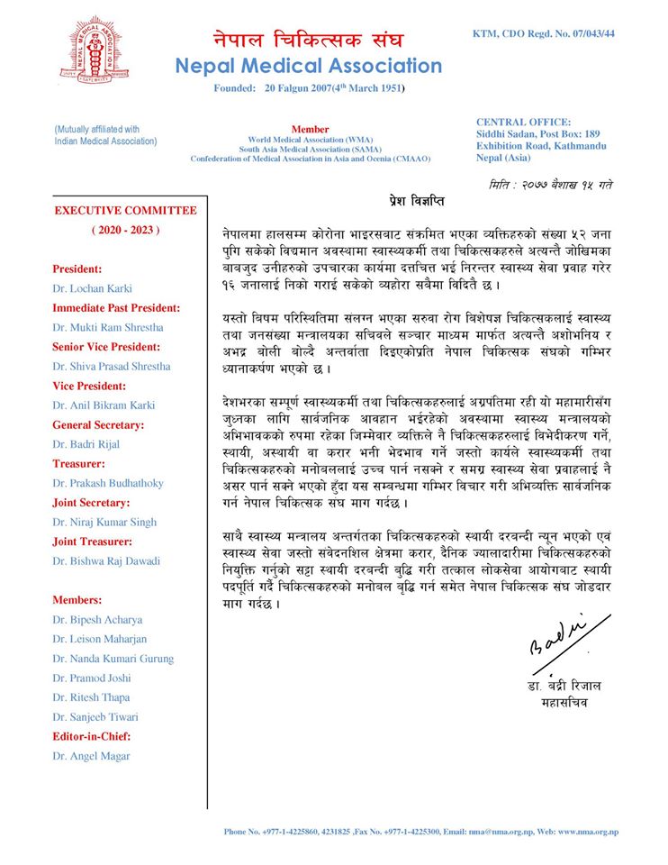 काठमाडौं - नेपाल चिकित्सक संघले स्वास्थ्य तथा जनसंख्या मन्त्रालयका सचिवले विचार गरी मात्र अभिव्यक्ति सार्वजनिक गर्न माग गरेको छ।