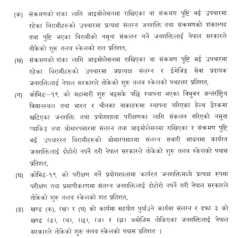 गत ९ चैतमा बसेको मन्त्रिपरिषदको बैठकले कोरोनाको उपचार तथा रोकथाममा खटिने स्वास्थ्यकर्मीलाई ५०, ७५ र १०० प्रतिशतको दरले जोखिम भत्ता उपलव्ध गराउने निर्णय गरेको थियो।