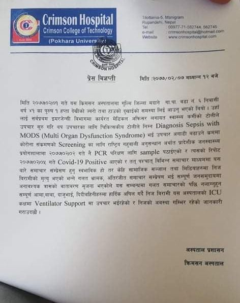 कठमाडौं- क्रिमसन अस्पतालले आफूकहाँ उपचाररत एक बिरामीको मृत्यु भएको भन्दै प्रकाशित समाचार गलत र भ्रामक भएको बताएको छ।