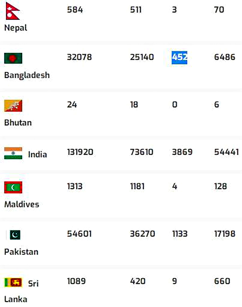 यसैगरी पाकिस्तानमा १ हजार १ सय ३३ जना, बंगलादेशमा ४ सय ५२, भुटानमा शून्य, माल्दिभ्समा ४ र श्रीलंकामा ९ जनाले कोरोनाका कारण ज्यान गुमाएका छन्।