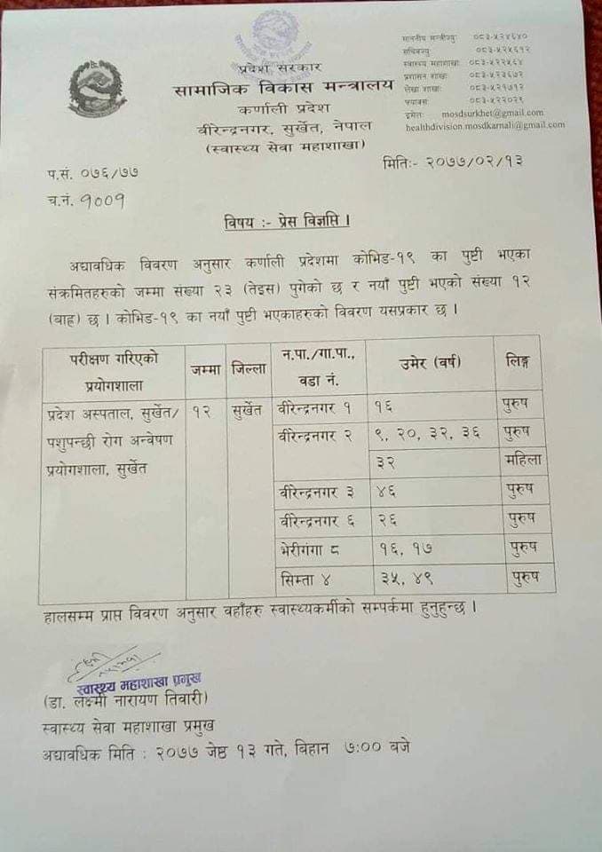 काठमाडौं- सुर्खेतमा थप १२ जनामा कोरोना भाइरसको संक्रमण देखिएको छ। कर्णाली प्रदेश सामासजिक विकास मन्त्रालयका अनुसार सुर्खेत वीरेन्द्रनगर, भेरीगंगा र सिम्तामा संक्रमित फेला परेका हुन्।