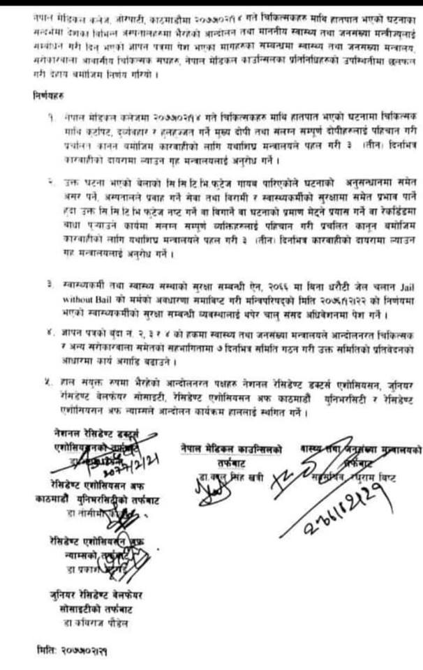 स्वास्थ्य तथा जनसंख्या मन्त्रालयसँग बुधबार पाँच बुँदे सहमतिपछि आन्दोलन स्थगित गर्ने केही चिकित्सकले सम्झौता गरेका थिए।
