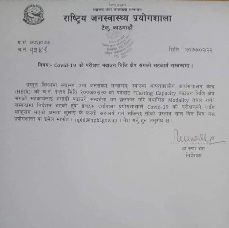 परीक्षणको क्षमता र दायरा बढाउन नीजि क्षेत्रसँगको सहकार्य बढाउने सन्दर्भमा प्रयोगशाला मोडालिटी तयार गर्ने गृहकार्यमा जुटेको छ।