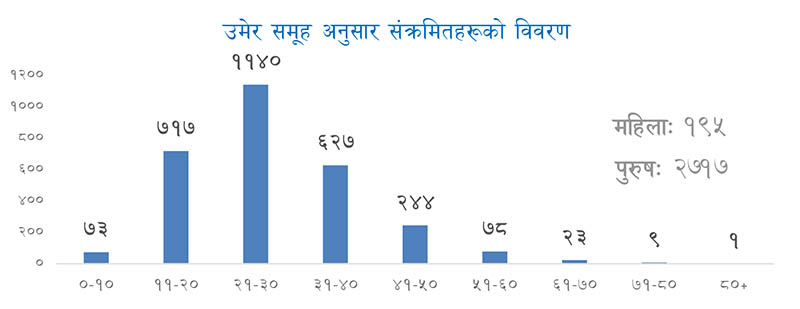 हालसम्म २ हजार ७ सय १७ जना पुरुषमा कोरोना संक्रमण पुष्टि भएको छ भने १ सय ७५ महिला यो भाइरसबाट संक्रमित भएका छन्। उनका अनुसार हालसम्म कोरोना संक्रमितको संख्या २९१२ पुगेको छ।