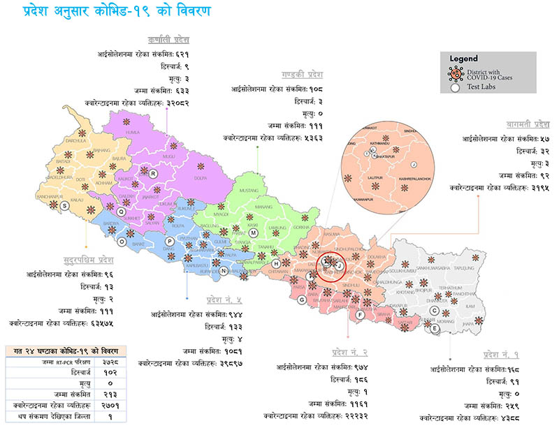 गण्डकीमा हाल १ सय ८ जना आइसोलेसनमा छन् भने डिस्जार्च हुनेको संख्या तीन छ। ५ हजार ३ सय ६३ जना क्वारेन्टाइनमा छन्। सुदूरपश्चिम प्रदेशमा ९६ जना आइसोलेसनमा, १३ डिस्जार्च र ६३ हजार ५ सय ७५ जना क्वारेन्टाइनमा रहेको मन्त्रालयले जनाएको छ। क्वारेन्टाइनमा रहेको संख्या सुदूरपश्चिममा धेरै छ।