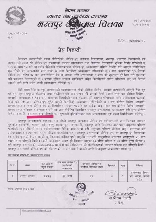 काठमाडौं- भरतपुर कोरोना विशेष (अस्थायी) अस्पताल मंगलबारदेखि बन्द गरिएको छ। अस्पतालले विज्ञप्ति जारी गर्दै मंगलबारदेखि अस्पताल बन्द गरिएको जनाएको छ।