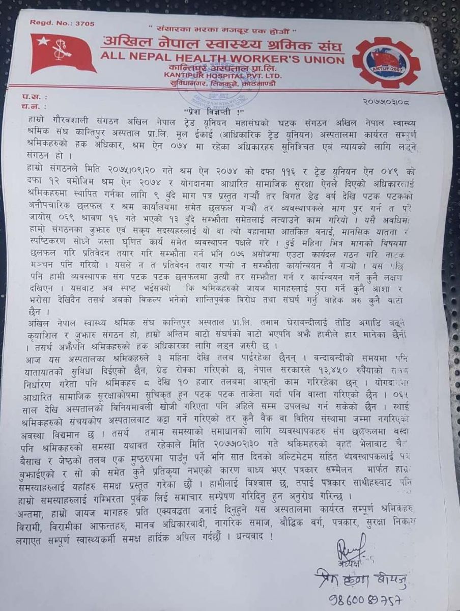 कान्तिपुर अस्पतालमा कार्यरत कर्मचारीले तीन महिनादेखि तलब समेत नपाएको अखिल नेपाल स्वास्थ्य श्रमिक संघ कान्तिपुर अस्पतालका अध्यक्ष प्रेम कृष्ण बोयजुले बताए।