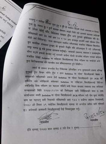 ‘परीक्षणपश्चात कोरोना संक्रमित देखिई आइसोलेसनमा राखिएका बिरामीलाई विनापरीक्षण घर फर्काउने भन्ने कुरा किञ्चितरुपमा पनि संविधानसम्मत देखिँदैन, ’ सर्वोच्चको आदेशमा उल्लेख छ।