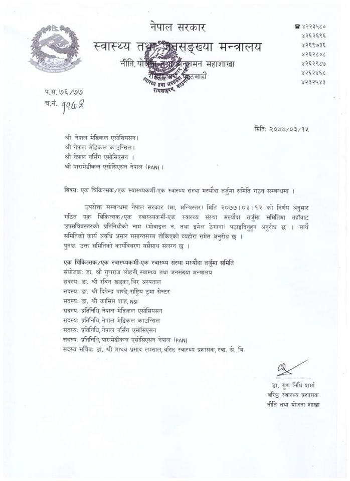 मन्त्रालयका सहसचिव डा गुणराज लोहनीको संयोजकत्वमा गठित उक्त समितिको सदस्यमा वीर अस्पतालका डा रविन खड्का, राष्ट्रिय ट्रमा सेन्टरका डा दीपेन्द्र पाण्डे, निक साइमन्स इन्स्ट्च्यिुटका डा कासिम शाह रहेका छन्।