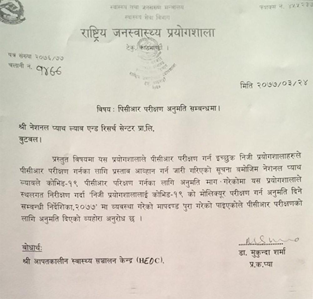 राष्ट्रिय जनस्वास्थ्य प्रयोगशालाको ‘निजी प्रयोगशाला कोभिड–१९ को मोलिक्युर परीक्षण गर्न अनुमति दिने सम्बन्धी निर्देशिका २०७७’ को सबै मापदण्ड पूरा गरेपछि नेसनल प्याथ ल्याबले पिसिआर परीक्षणका लागि स्वीकृति पाएको हो।