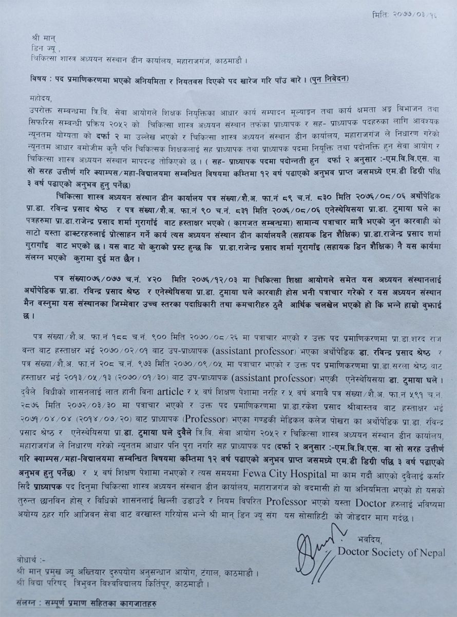 डक्टर्स सोसाइटी अफ नेपालका नाममा परेको उजुरीमा एमबिबिएस उत्तीर्णपछि कम्तीमा १२ वर्ष पढाएको र एमडीपछि ३ वर्ष पढाएको अनुभव नपुगेको उल्लेख छ। चिकित्सकद्वयको ५ वर्ष शिक्षण पेसामा नभएको र दुवै त्यस समयमा फेवासिटी अस्पतालमा काम गर्दै आएको अवस्थामा कसरी सिधै प्राध्यापक पद दिइयो? भनी प्रश्न गरिएको छ।