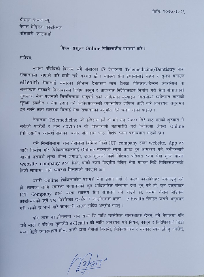 पत्रमा भनिएको छ, ‘अनलाइन चिकित्सकीय परामर्श सेवा प्रदान गर्दा के कस्ता कार्यविधिहरु अपनाउनुपर्ने हो, स्वास्थ्य मन्त्रालयको कुन आधिकारिक संस्थामा दर्ता हुनुपर्ने हो, कुन प्रक्रियाबाट आईसिटी कम्पनीले सेवा सञ्चालन गर्न पाउने हो? काउन्सिको कुनै प्रष्ट निर्देशिका छ/छैन र ई हेल्थ सेवाहरु कसरी अनुगमन भइरहेको छ भन्ने बारे जानकारी पाउन अनुरोध गर्दछु।’