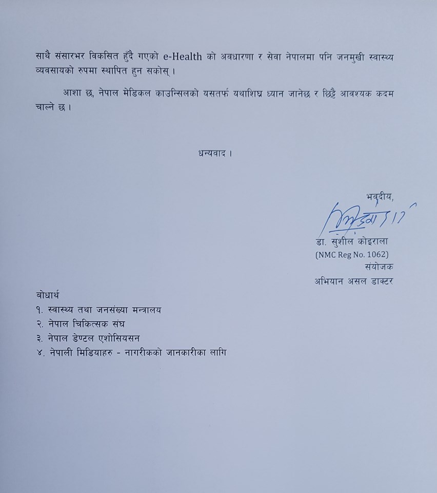 उनले नेपाल मेडिकल काउन्सिलमा पत्र पठाउँदै यस सम्बन्धी कुनै प्रष्ट निर्देशिका भए नभएको र ईहेल्थ सेवाहरुको अनुगमन के कसरी भइरहेको छ भन्ने बारे प्रश्न गरेका छन् ।