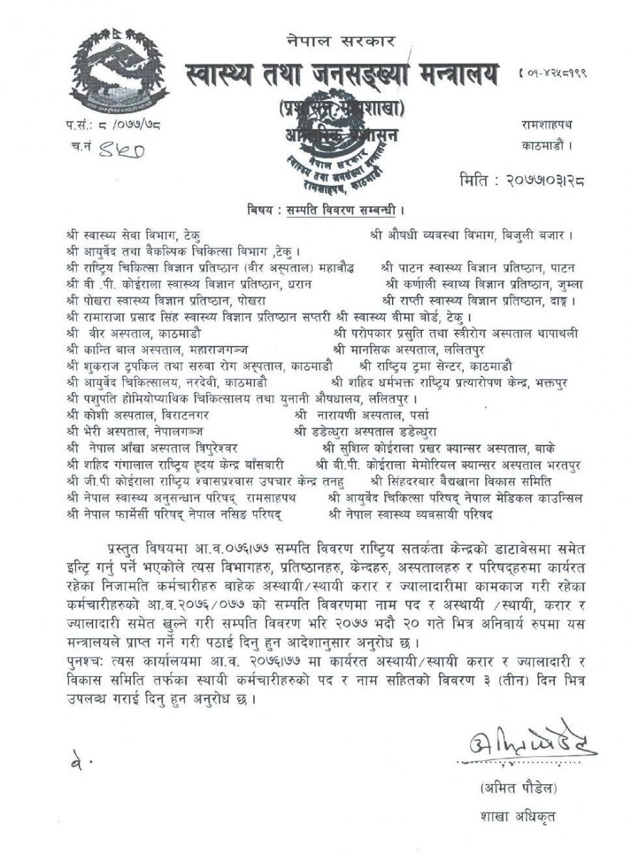 मन्त्रालयले सबै विभागहरु, प्रतिष्ठानहरु, केन्द्रहरु, अस्पतालहरु र परिषदमा कार्यरत सबैलाई विवरण पठाउन भनेको छ।