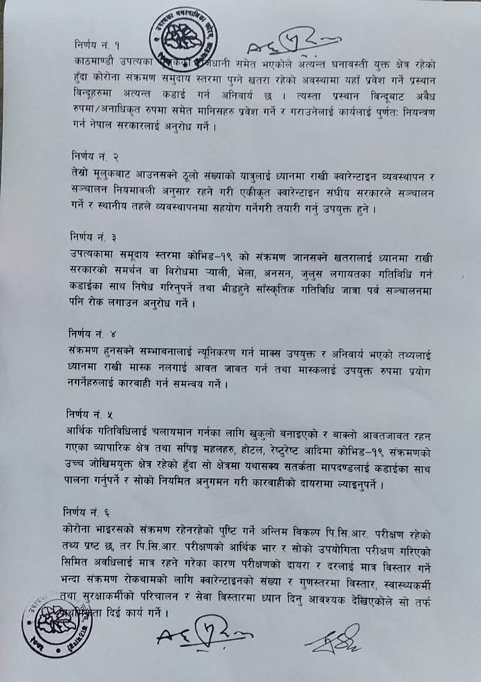 उपत्यकामा अत्यन्त घनाबस्ती रहेकाले कोरोना संक्रमण समुदाय स्तरमा पुग्ने खतरा रहेको भन्दै उपत्यका प्रवेश गर्ने प्रस्थान विन्दूहरुमा अत्यन्त कडाई गर्न सरकारलाईअ अनुरोध गर्ने निर्णय समेत फोरमले गरेको छ। यस्तै क्वारेन्टाइन व्यवस्थापन र सञ्चालन नियमावली अनुसार रहने गरी एकीकृत क्वारेन्टाइन संघीय सरकारले सञ्चालन गर्ने र स्थानीय तहले व्यवस्थापनमा सहयोग गर्नेगरी तयारी गर्न सरकारलाई अनुरोध गर्ने निर्णय पनि मेयरहरुले गरेका छन्।