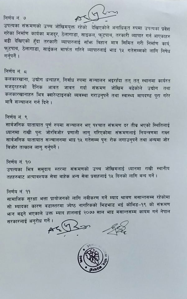 अनाधिकृत रुपमा उपत्यका प्रवेश गरेका निर्माण कार्यका मजदुर, ठेलागाडा, साइकल, फुटपाथ, तरकारी व्यापार गर्न आएकाहरु ब्ढी देखिएको भन्दै तरकारी व्यापारलाई साँझ विहान मात्र सञ्चालन गर्न दिने र निर्माण कार्य, फुटपाथ, ठेलागाडा, साईकलमार्फत गरिने व्यापारलाई भदौं १५ गतेसम्म निषेध गर्ने निर्णय पनि बैठकले गरेको छ।