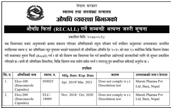 विभागले बजार अनुगमनका क्रममा इलोज-१०० र इलोज-२००(इन्ट्राकनेजोल क्याप्सुल) बजारबाट तुरुन्त फिर्ता गर्न र सोको विवरण विभाग पेश गर्न सूचना जारी गरेको छ।अप्रिल २०१९ मा बनेको इलोज-१०० २०२१ मार्च सम्म र इलोज-२०० २०२० अक्टुबरसम्म प्रयोग मिति रहेको छ।
