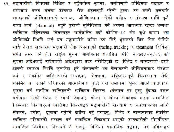 फैसलाको ६३ नम्बर बुदाँमा महामारीको विषयको निश्चित र पहुँचयोग्य सूचना, सम्प्रेषणको जोखिमता घटाउन र समाजमा गलत सूचना जानबाट रोक्न महत्वपूर्ण रहेको भनिएको छ।