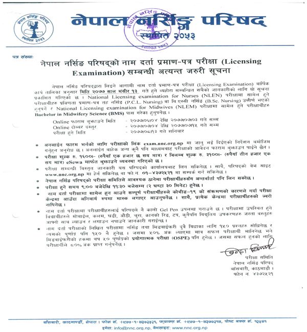 काउन्सिलले परीक्षा सम्बन्धी सूचना जारी गर्दै असोज ४ गतेदेखि कात्तिक ३ गतेसम्म अनलाइन फारम भर्नुपर्ने जनाएको छ। अनलाइन फारम भर्नका लागि exam.nnc.org.np मा गई भर्न सकिने छ।