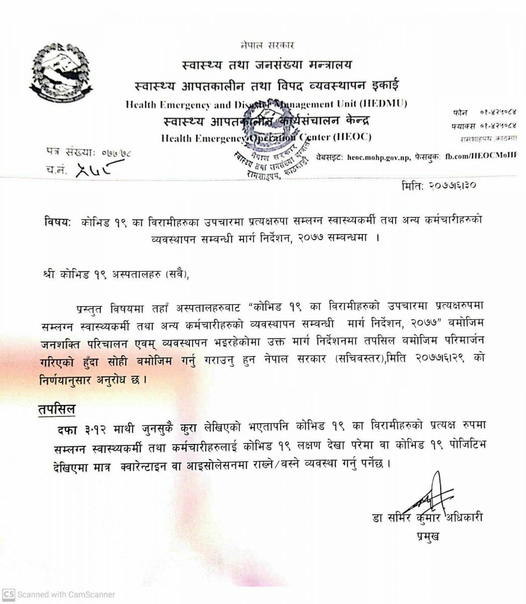मन्त्रालयको स्वास्थ्य आपतकालिन तथा विपद् व्यवस्थापन ईकाईले सत्रै कोभिड९१ अस्पतालहरुलाई पत्राचार गर्दै कोभिड बिरामीको उपचारमा खटिएका स्वास्थ्यकर्मी तथा कर्मचारीलाई कोभिडकोलक्षण देखिए वा पोजिटिभ आएमा मात्र क्वारेन्टाइन वा आइसोलेसन राख्ने/ बस्ने व्यवस्था गर्नुपर्ने जनाएको छ।