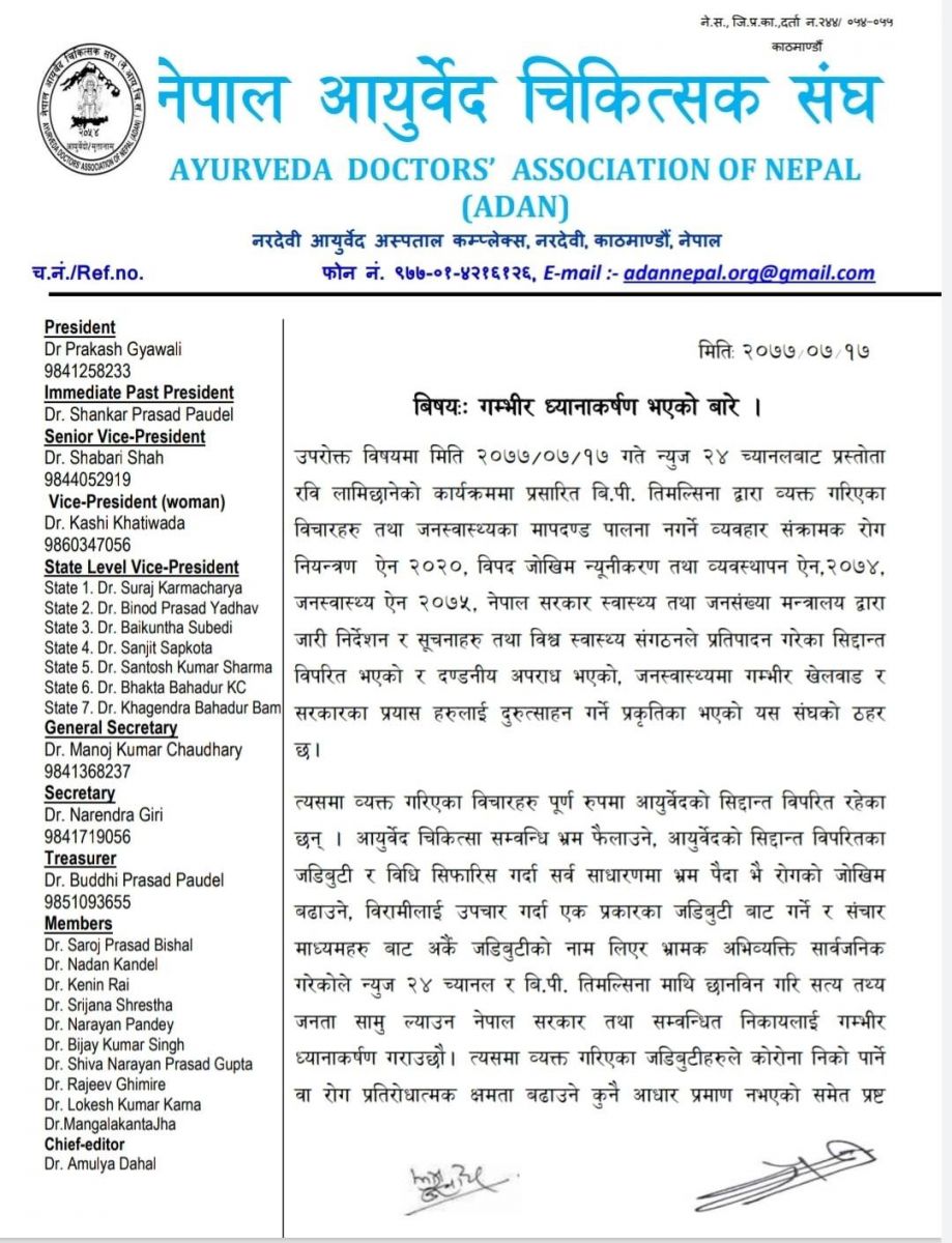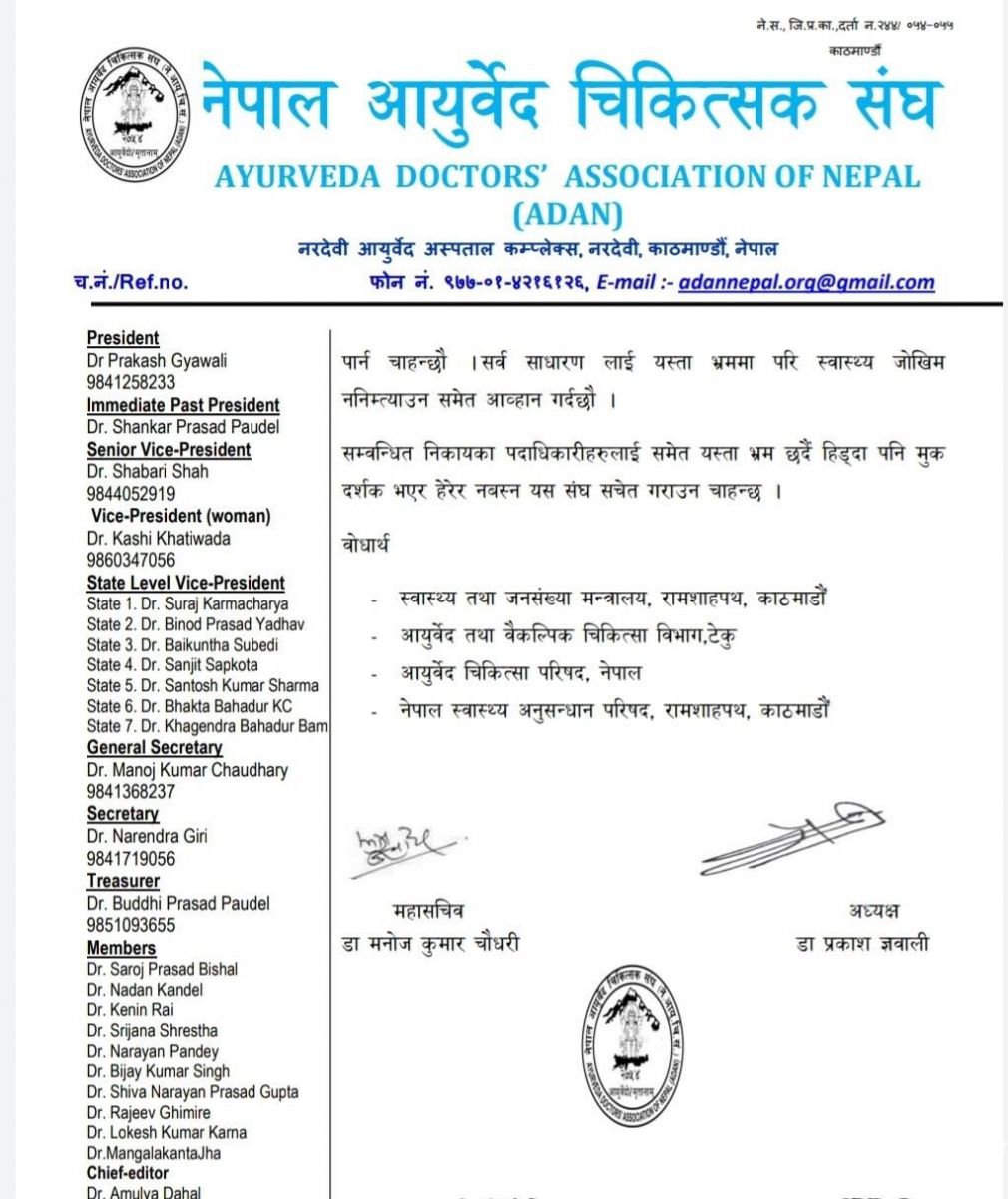 संघले विज्ञप्ति जारी गर्दै भनेको छ, 'त्यसमा व्यक्त गरिएका विचारहरु पूर्ण रुपमा आयुर्वेदको सिद्धान्तविपरीत रहेका छन्। आयुर्वेद चिकित्सासम्बन्धी भ्रम फैलाउने, आयुर्वेदको सिद्धान्त विपरितका जडिबुटी र विधि सिफारिस गर्दा सर्व साधारणमा भ्रम पैदा भएर रोगको जोखिम बढाइएको छ। बिरामीलाई उपचार गर्दा एक प्रकारका जडिबुटीबाट गर्ने र सञ्चार माध्यमहरुबाट अर्कै जडिबुटीको नाम लिएर भ्रामक अभिव्यक्ति सार्वजनिक गररिएको छ।'