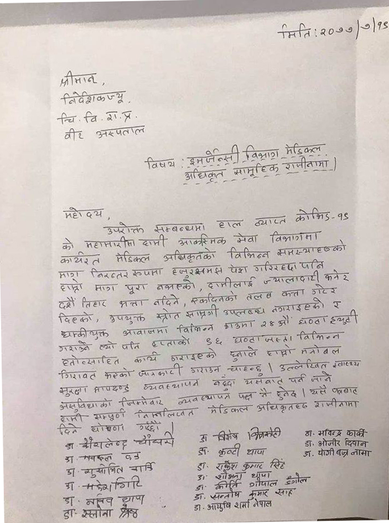 राजीनामा दिनेमा डा कौशलेन्द्र चौधरी, डा महेश गिरी, डा कृष्टि थापा, डा राकेशकुमार सिंह, डा आयुषी शर्मा नेपाल लगायत १६ जना चिकित्सक छन्।