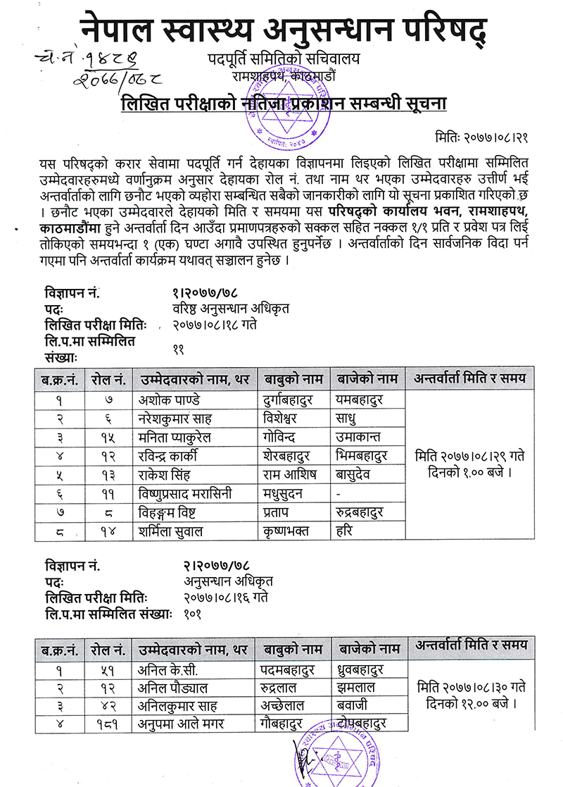 परिषदले आज सूचना निकाल्दै अन्तर्वार्ताको मिति पनि सार्वजनिक गरेको छ। सूचना अनुसार वरिष्ठ अनुसन्धान अधिकृतको अन्तर्वार्ता मंसिर २९ गते हुने छ।