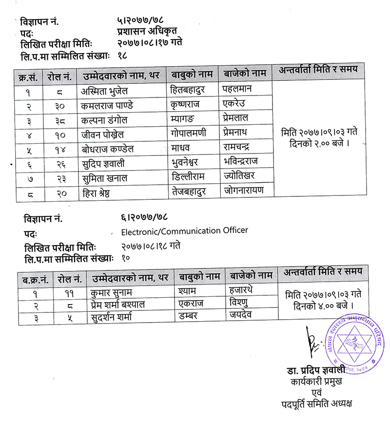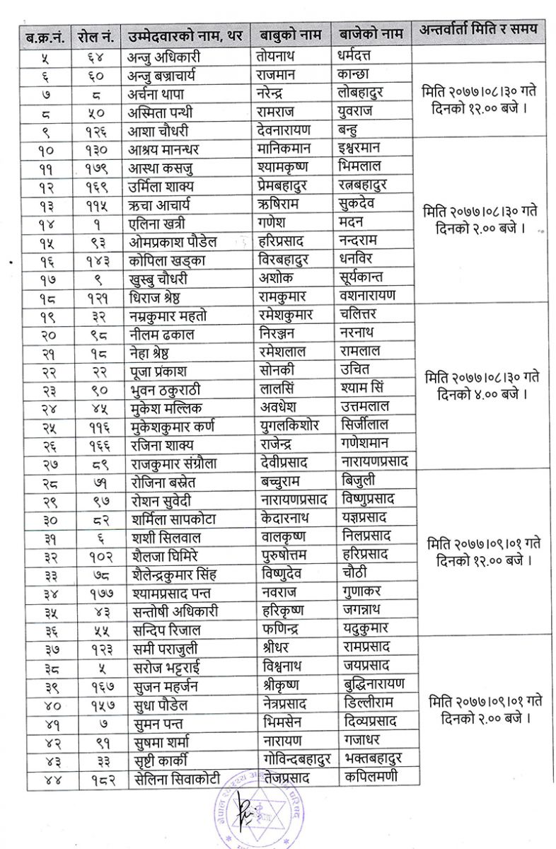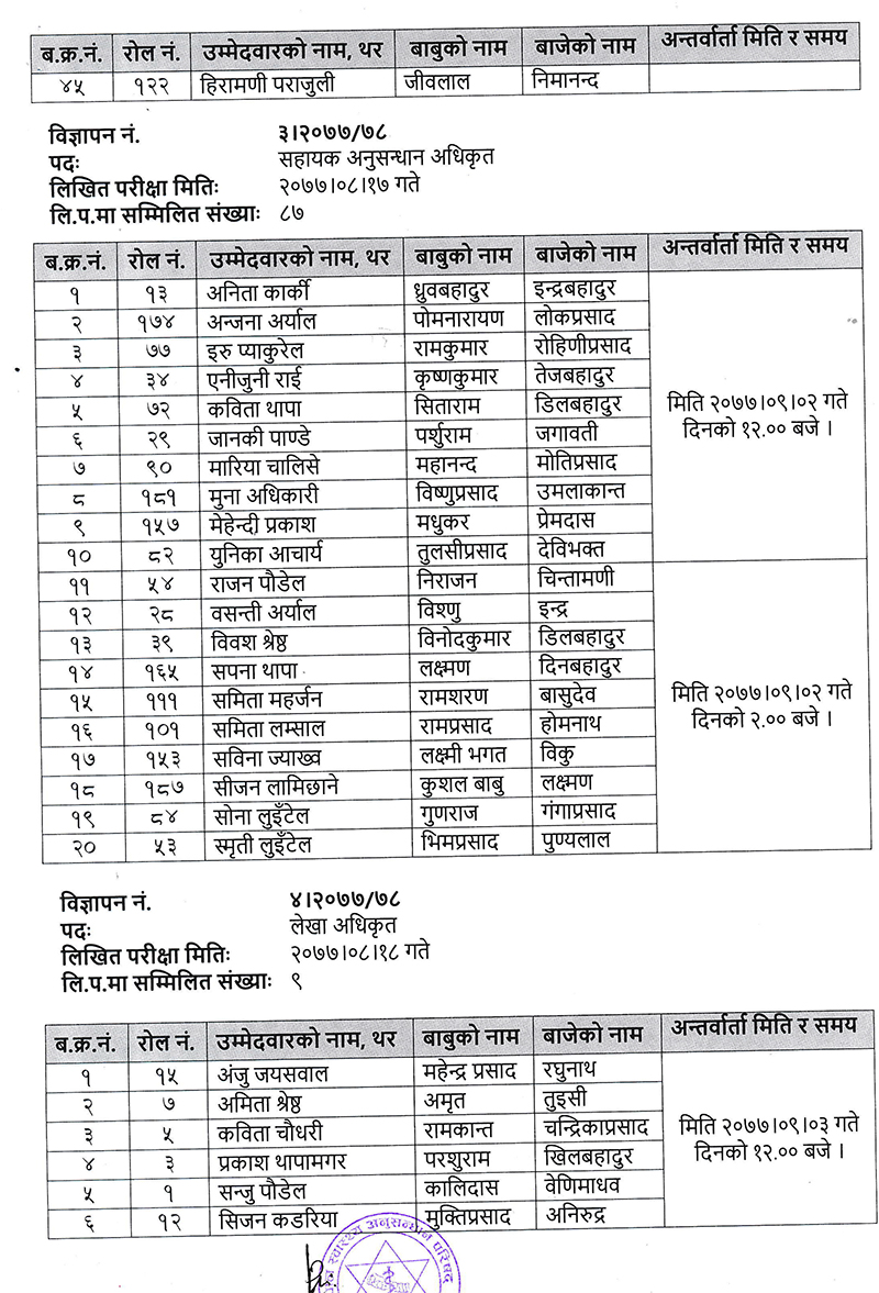 यस्तै, अनुसन्धान अधिकृतको मंसिर ३० र पुस १ गते, सहायक अनुसन्धान अधिकृतको पुस २ गते, लेखा र प्रशासन अधिकृतको ३ गते तथा कम्युनिकेशन अफिसरको पनि ३ गते हुने छ।