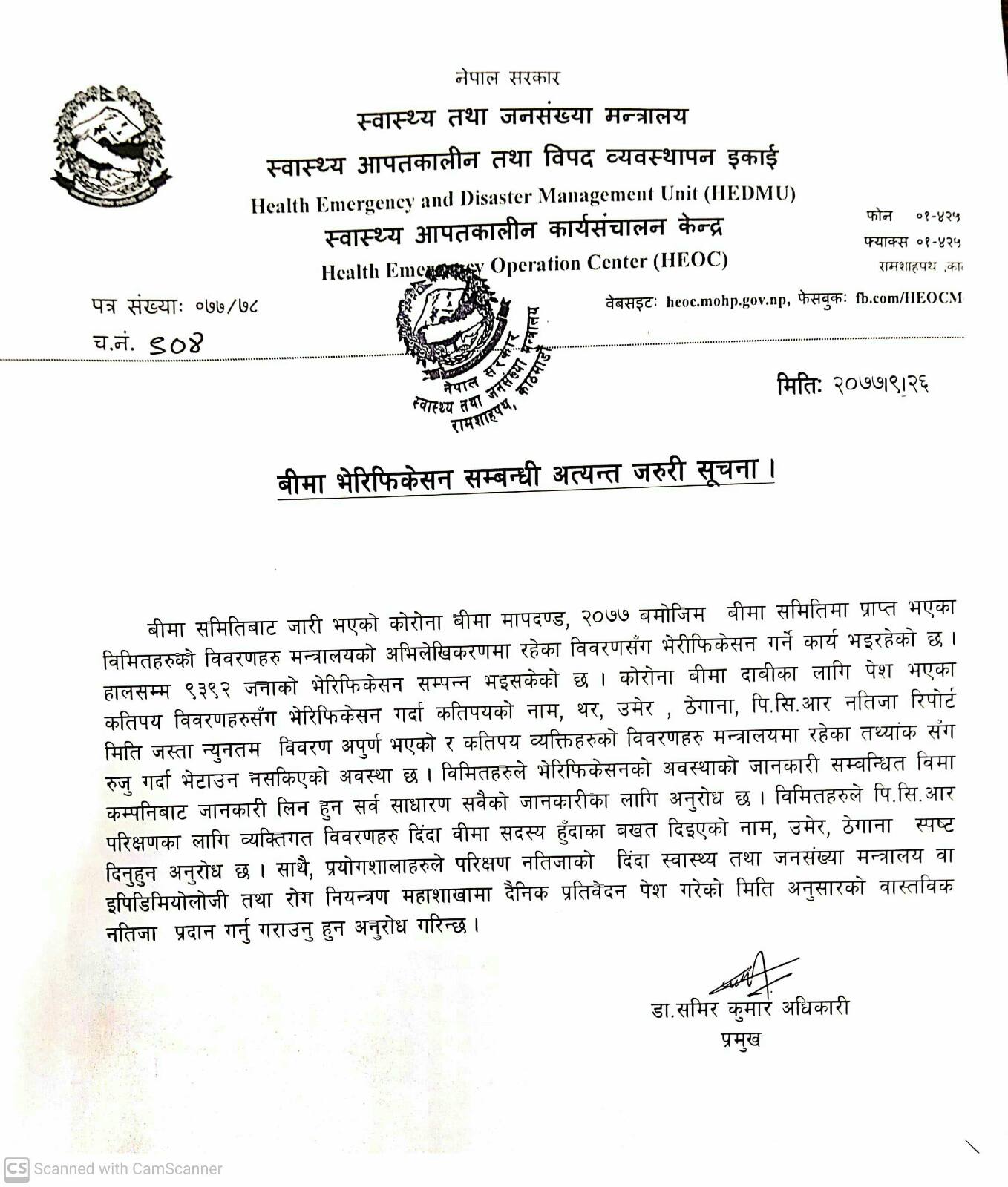 मन्त्रालयले कोरोना बीमा दाबीका लागि पेसका विवरणहरु भेरिफिकेसन गर्दा विवरण अपुग भएकाले बिमितले सम्बन्धित कम्पनीसँग अवस्था जानकारी लिन अनुरोध गरेको छ।