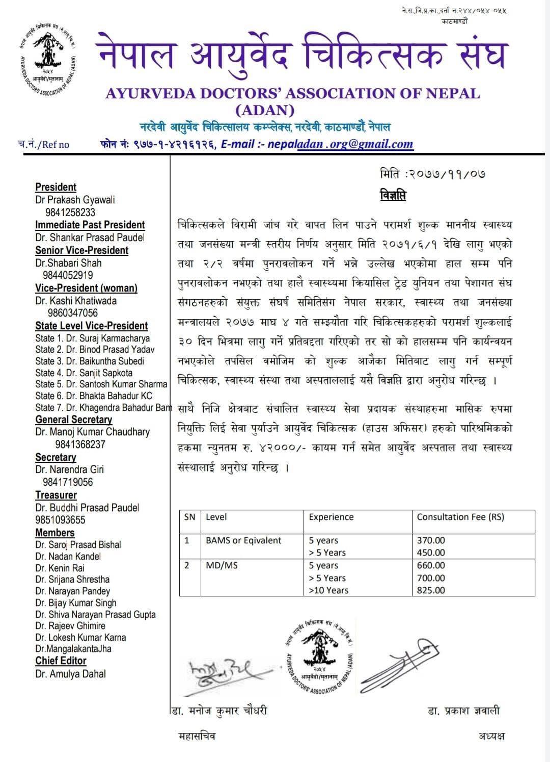 संघका अनुसार बिएएमएस तहको शैक्षिक योग्यता पूरा गरेर ५ वर्षभन्दा कम अनुभव भएकाले ३७० र सोभन्दा बढी अनुभव भएकाले ४५० रुपैँया परामर्श शुल्क लिने निर्णय गरेको छ ।