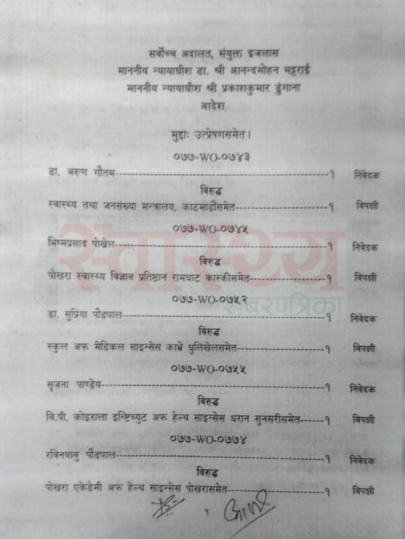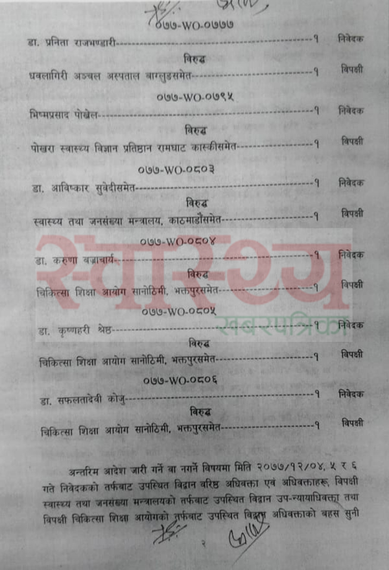 काठमाडौं– सर्वोच्च अदालतले चिकित्सा शिक्षा आयोगलाई चिकित्सा शिक्षा तर्फको स्नातकोत्तर तह (पिजी) मा मेरिट लिष्टबाट हटाइएका विद्यार्थीको योग्यताक्रमको सूची पुन प्रकाशित गर्दै अध्ययनको अवसर समेत प्रदान गर्न अन्तरिम आदेश दिएको छ।