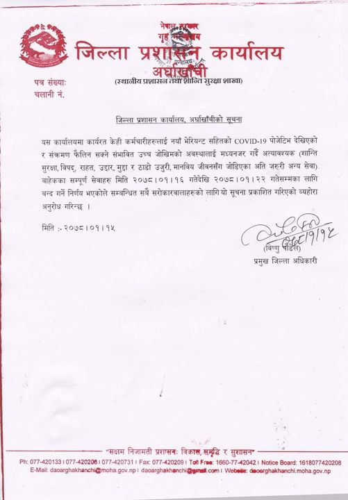 काठमाडाैं- जिल्ला प्रशासन कार्यालय अर्घाखाँचीमा कार्यरत केही कर्मचारीमा कोभिड-१९ संक्रमण देखिएपछि प्रशासन कार्यालय बिहीबारदेखि बन्द गरिने भएको छ।