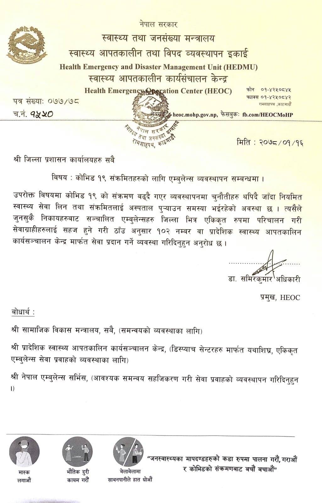 मन्त्रालयको स्वास्थ्य आपतकालीन कार्यसंचालन केन्द्रले ७७ वटै जिल्ला प्रशासन कार्यालयलाई पत्र लेख्दै जुनसुकै निकायबाट सञ्चालित एम्बुलेन्सहरूलाई जिल्लाभित्र एकीकृत रुपमा परिचालन गर्न भनेको छ।