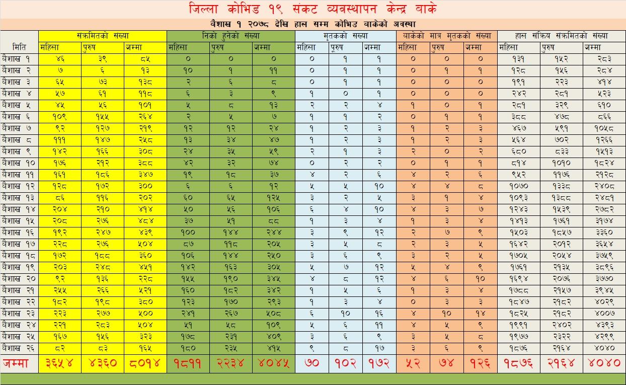 जिल्ला कोभिड-१९ संकट व्यवस्थापन केन्द्र (डिसिसिएमसी) बाँकेमा अनुसार वैशाख १ देखि २६ गतेसम्म ३ हजार ६५४ महिला र ४ हजार ३६० जना पुरुष गरी ८ हजार १४ जना कोरोना संक्रमित भएका छन्।