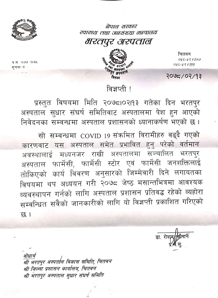 अस्पतालमा सञ्चालित फार्मेसी, फार्मेसी स्टोर एवम् फार्मेसी जनशक्तिलाई तोकिएको जिम्मेवारी दिन अस्पताल प्रशासन प्रतिवद्ध रहेको मेसु न्यौपानले बताए। भरतपुर अस्पतालको फार्मेसी स्टोर कानुन विपरीत अहेबको भरमा चल्दै आएपछि त्यहाँका फार्मासिस्टहरु शान्तिपूर्ण आन्दोलनमा थिए।