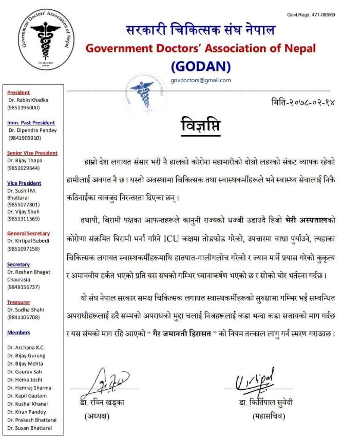 गोदानका अध्यक्ष डाक्टर रविन खड्का र महासचिव डाक्टर कीर्तिपाल सुवेदीले आज प्रेस विज्ञप्ति जारी गर्दै कोभिड आइसियु कक्षमा तोडफोड गर्ने, उपचारमा बाधा पुर्याउने जस्ता कार्य अमानवीय भएको भन्दै संघको गम्भीर ध्यानाकर्षण भएको जनाएका छन्।