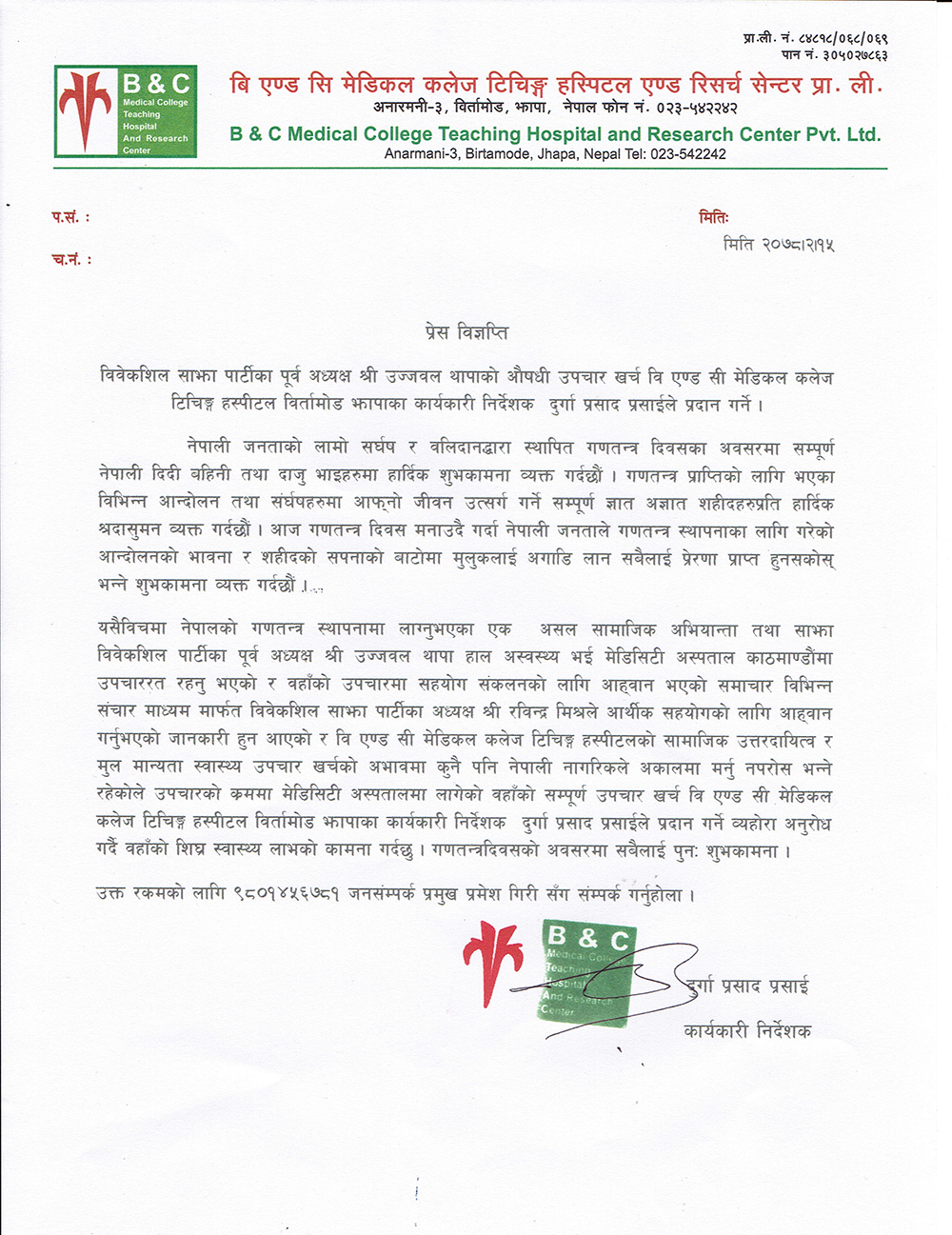 'सामाजिक अभियान्ता तथा विवेकशिल पार्टीका पूर्व अध्यक्ष थापाको उपचारमा सहयोग संकलन लागि आह्वान भएको जानकारी हुन आएकोले मेडिसिटी अस्पतालमा उपचाररत उहाँको सम्पूर्ण उपचार खर्च बिएन्डसीका कार्यकारी निर्देशक दुर्गा प्रसाईंले प्रदान गर्ने व्यहोरा अनुरोध गर्दै उहाँको शिघ्र स्वास्थ्य लाभको कामना गर्दछु,' विज्ञप्तिमा भनिएको छ।