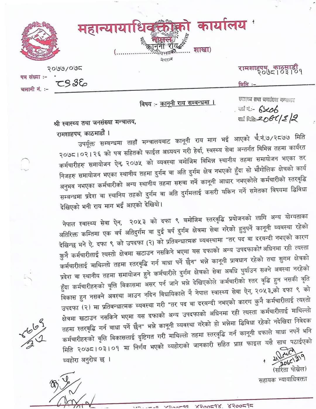 स्वास्थ्य मन्त्रालयले कानुनी रुपमा दुविधा भएपछि महान्यायाधिवक्ताको कार्यालयमा यसबारे प्रष्ट पार्न राय माग गरेको थियो। महान्यायाधिवक्ताको कार्यालयले उक्त विषयमा राय दिँदै पद तथा दरबन्दी नभएका कर्मचारीलाई त्यस्तो क्षेत्रमा खटाउन नसकिने तर उनीहरुको वृति विकासलाई दृष्टिगत गरी माथिल्लो तहमा स्तरवृद्धि गर्न सकिने राय दिएको छ।