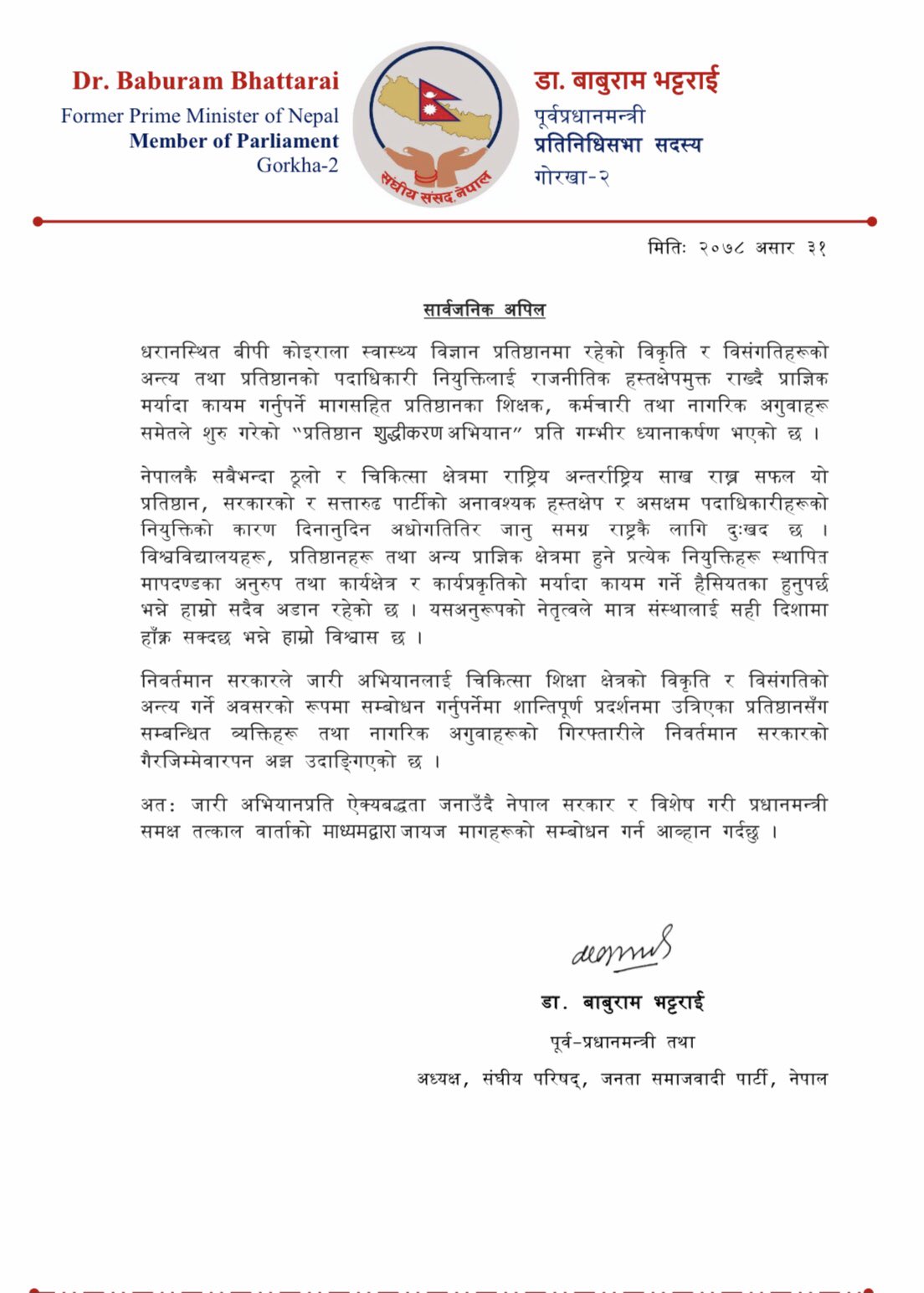 उनले प्रतिष्ठान सुद्धिकरण अभियान संयुक्त संघर्ष समितिको अभियानमा आफ्नो ऐक्यवद्धता रहेको भन्दै वार्ताको माध्यमद्धारा जायज मागहरुको सम्बोधन गर्न सरकार र प्रधानमन्त्रीलाई आग्रह समेत गरेका छन्।