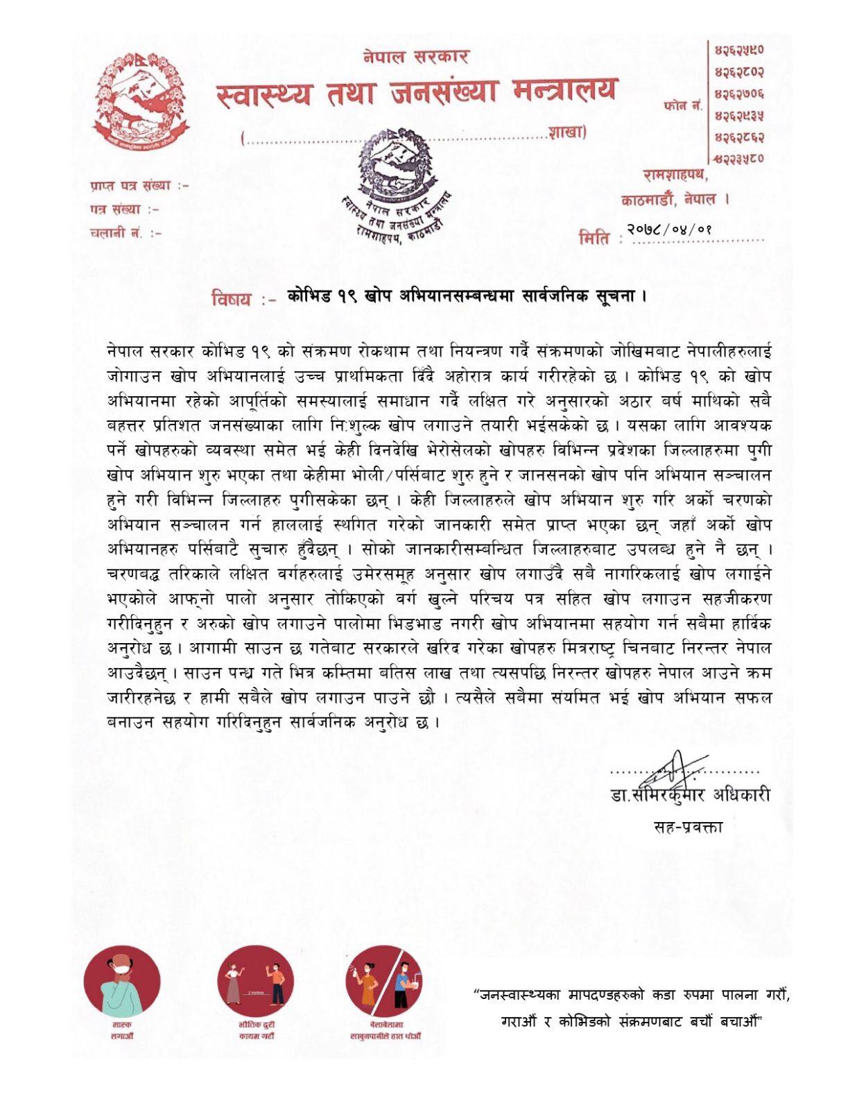 मन्त्रालयका सहप्रवक्ता डा समिरकुमार अधिकारीले जारी गरेको विज्ञप्तिमा केही जिल्लाहरुले खोप अभियान शुरु गरेर अर्को चरणको अभियान सञ्चालन गर्न हाललाई स्थगित गरेको जानकारी पनि उल्लेख छ।