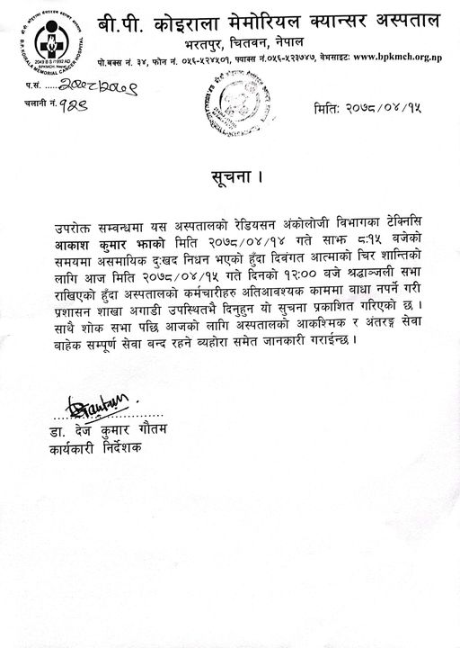 झाको निधनको दुखमा अस्पतालले आज आकस्मिक र अंतरंग बाहेकका सबै सेवा बन्द गरेको छ।