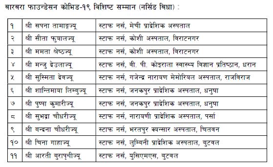 बारबरा फाउन्डेसन कोभिड–१९ विशिष्ट सम्मानका लागि निर्णायक समितिमा प्राडा भगवान कोइराला (अध्यक्ष, नेपाल मेडिकल काउन्सिल), डा लोचन कार्की (अध्यक्ष, नेपाल चिकित्सक संघ), प्रा मनकुमारी राई (अध्यक्ष, नेपाल नर्सिङ्ग संघ), दयालक्ष्मी वैद्य (एसोसियट प्रोफेसर, काठमाडौं विश्वविद्यालय) तथा पूर्व–अध्यक्ष, नेपाल नर्सिङ्ग काउन्सिल तथा इ कुलमान घिसिङ्ग (पूर्व कार्यकारी निर्देशक नेपाल विद्युत प्राधिकरण) रहेका थिए।