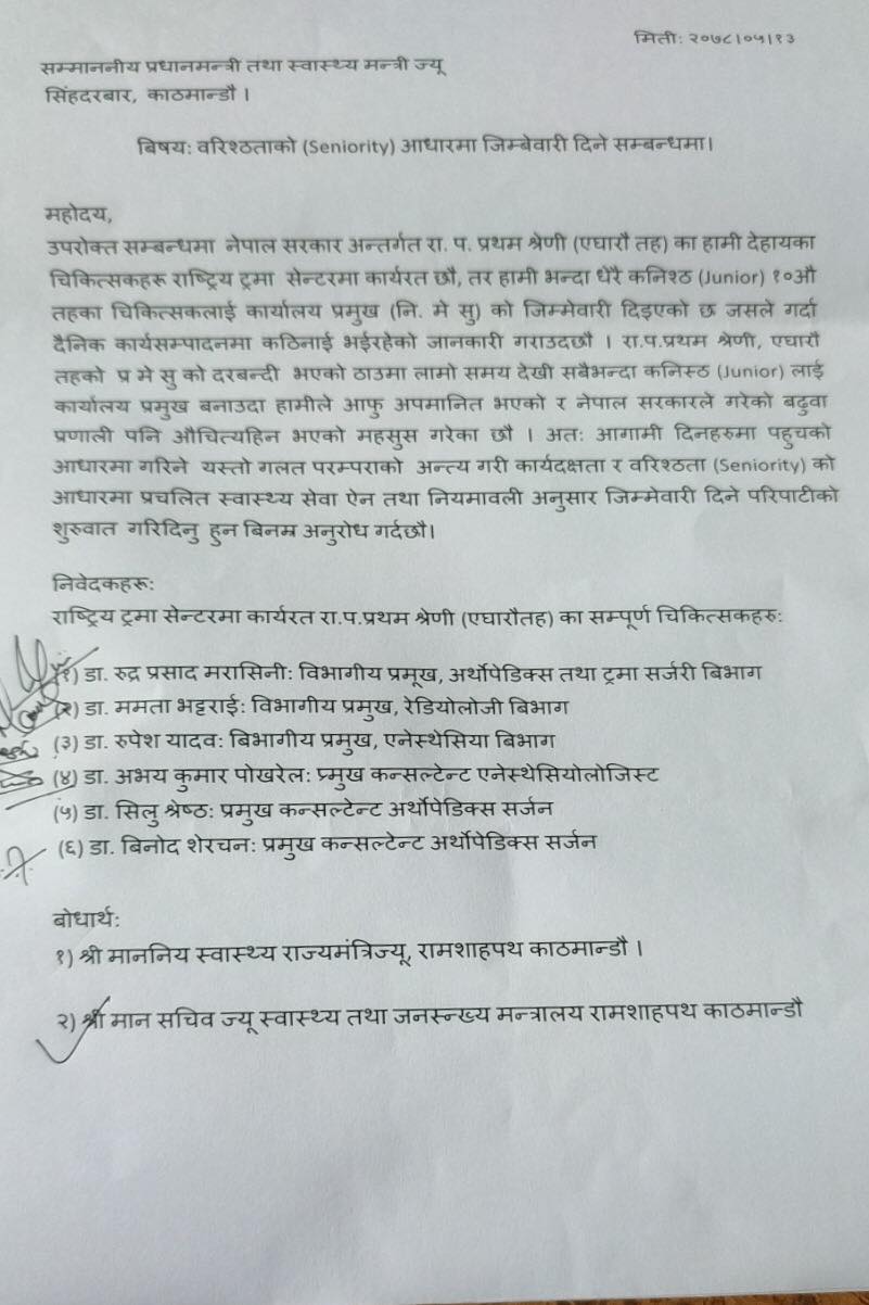 डा रुद्र मरासिनी, डा ममता भट्टराई, डा रुपेश यादव, डा अभयकुमार पोखरेल, डा सिलु श्रेष्ठ र डा विनोद शेरचनले पत्र लेख्दै वरिष्ठताका आधारमा जिम्मेवारी दिन अनुरोध गरेका हुन्।