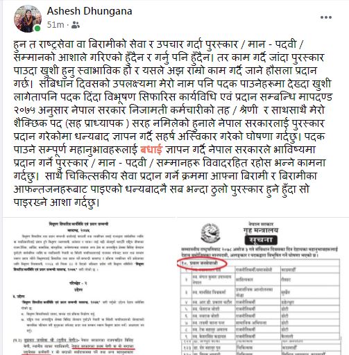 डा ढुंगानाले सामाजिक सञ्जाल मार्फत संविधान दिवसको अवसरमा सरकारले घोषणा गरेको पदक नलिने निर्णय गरेको बताएका हुन् ।